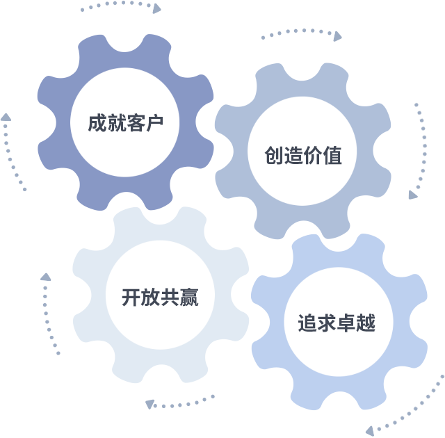 成就客户是一切决策的出发点,创造价值是衡量所有工作的标准,追求卓越是J9九游.com做事做人的态度,开放共赢是J9九游.com的格局也是最终的结果。价值观的齿轮环环相扣,推动着组织里的每个人不断向前。
